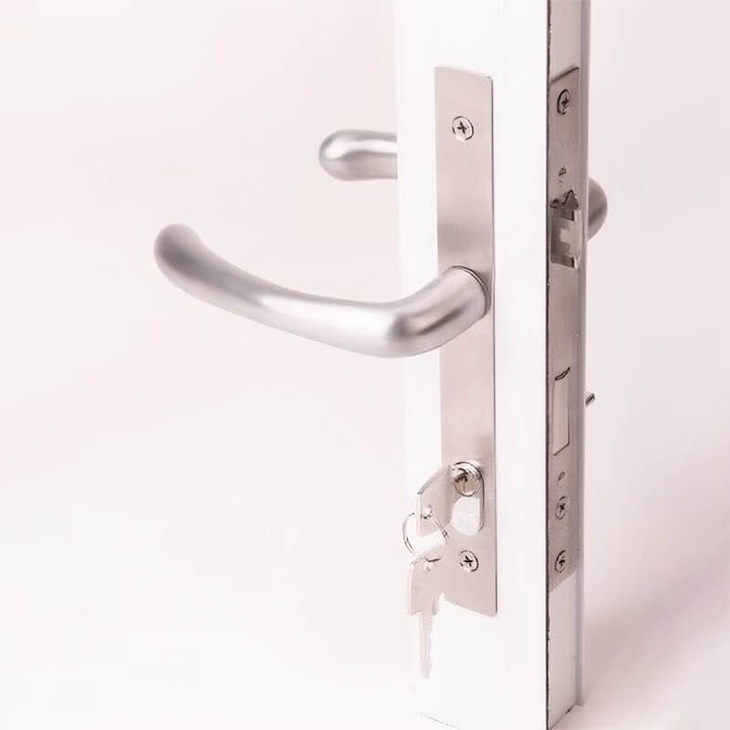 Standard features of the GenTek storm doors include a 2″ overlap frame (Bradford) or a 2 1/4″ overlap frame (Monarch), 1/2″ increments width + height, 3 mm tempered glass, superior weatherstripping system, reinforced corners, durable aluminum screen, four heavy-duty hinges, colour-matched closer, and insulated kickplate (standard on Monarch doors only).